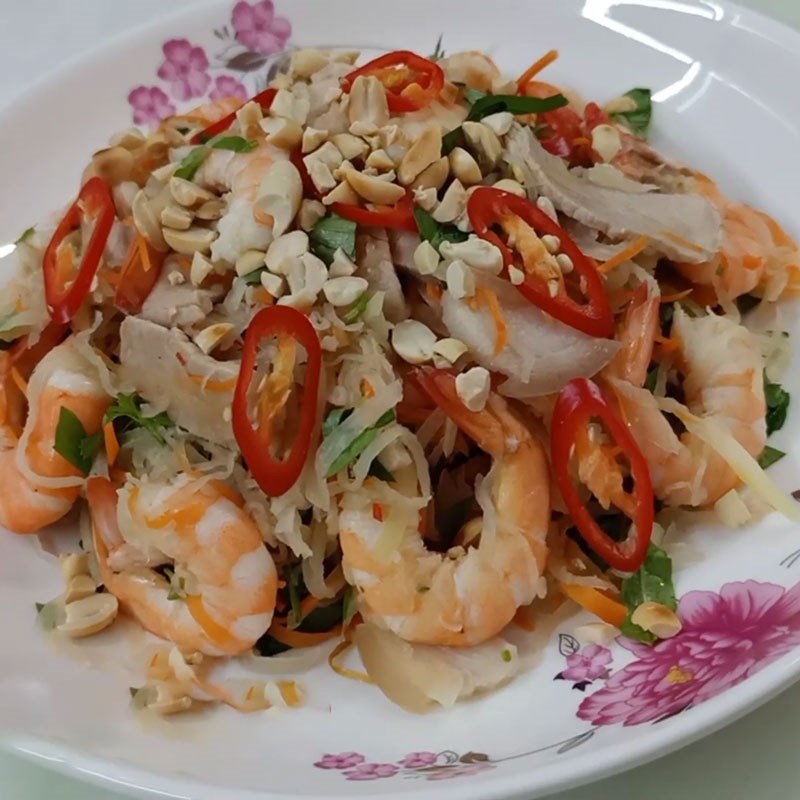 Khi các nguyên liệu đã sẵn sàng, bạn cho tôm, rau củ đã bào sợi vào tô lớn, rưới nước trộn gỏi vào và trộn đều tay. Trộn nhanh và nhẹ nhàng để nguyên liệu ngấm đều gia vị mà không bị nát. Cuối cùng, bày gỏi ra đĩa, rắc đậu phộng rang giã dập và một ít rau thơm lên trên để tăng thêm hương vị và sự hấp dẫn cho món ăn.